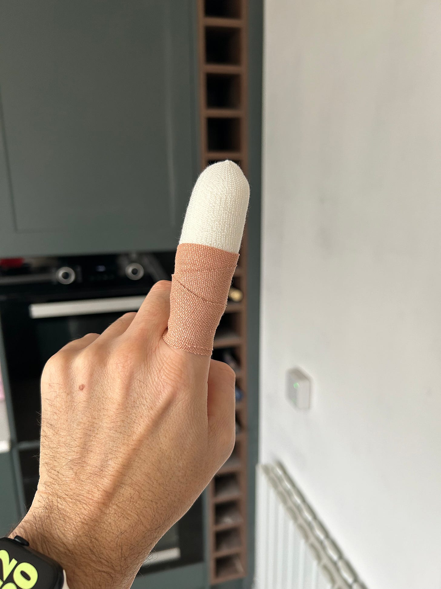 I was laying a new floor in the kitchen. There was only a little left to do. It had been a bit of a slog because we had decided on a herringbone effect and it was more fiddly than anticipated. Anyway, to cut a long story short, I chopped off the end of my finger and it hurt like hell. So I haven’t been able to strum the guitar, play the piano, shuffle cards or, more importantly, type very well on my laptop.